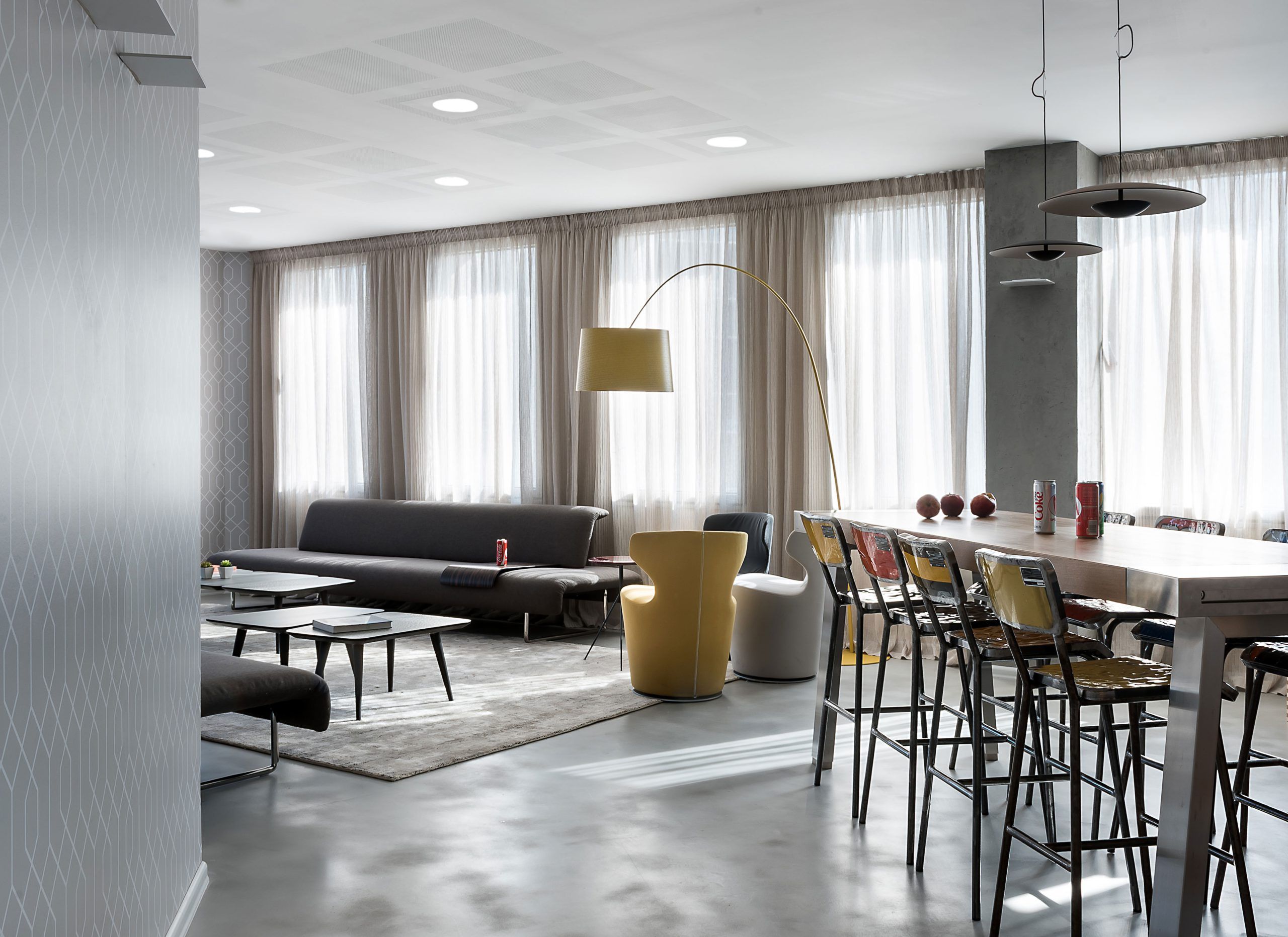 בפינת הישיבה שולבו רהיטים אלגנטיים של מותגי על כדוגמת B&B ITALIA ו-baxster . האדריכלית בחרה בצורות ישיבה מגוונות על מנת לאפשר לעובדים לבחור את הסגנון המועדף עבורם בהתאם לסיטואציה.