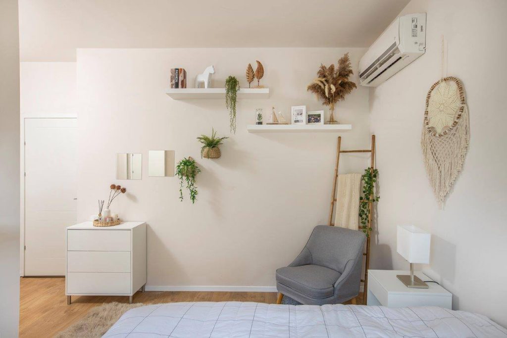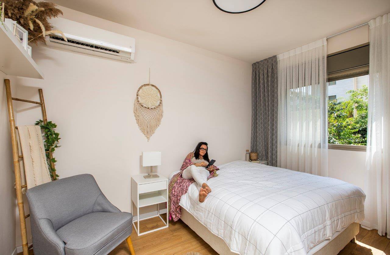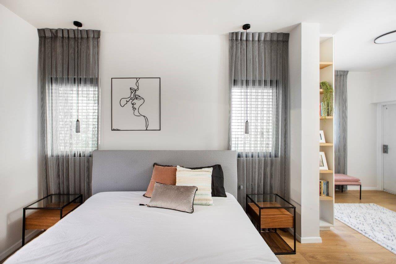"אל חדר השינה של ההורים נכנסים דרך חדר הארונות וההלבשה של בני הזוג. מול המיטה תוכנן ארון קיר גדול, שמגדיל אף יותר את שטחי האחסון, בו שקוע גם מסך הטלוויזיה". מסכמת המעצבת.