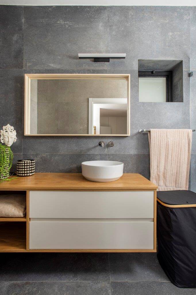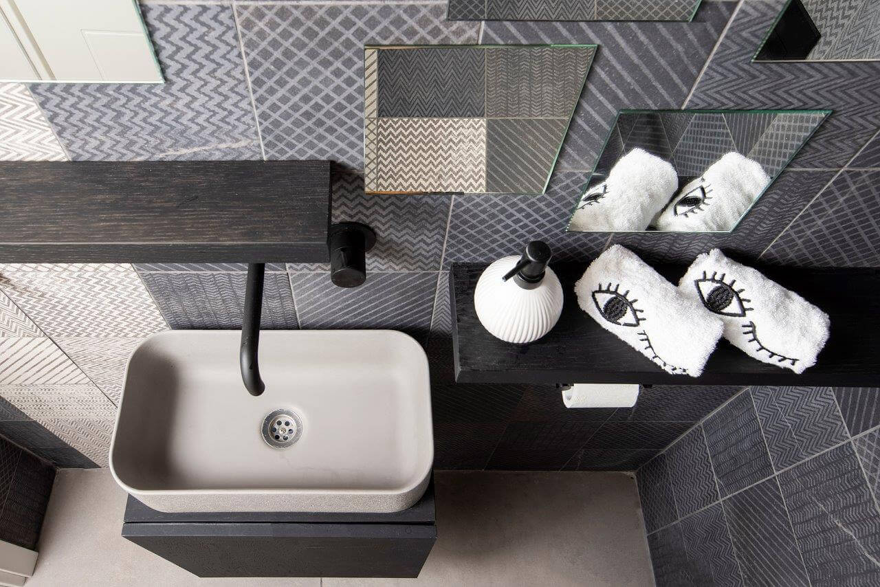 שירותי האורחים, שממוקמים גם הם בקומת הכניסה, הם האזור בו יכלה המעצבת להתפרע: "את הקירות בחרתי לחפות באריחים שחורים ואפורים בגודל 20/20 ס"מ, עליהם מודפסות דוגמאות גיאומטריות. פרסנו אותם בפריסה לא קונבנציונלית ותלינו על גבם מדפים צפים מעץ אלון מושחר שמעצימים אף יותר את הדרמה בחלל".