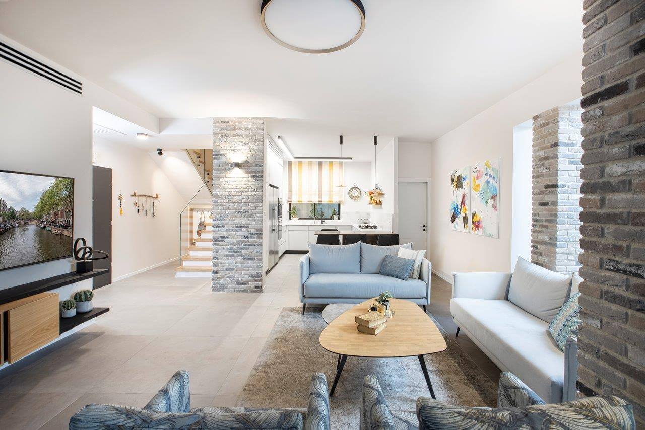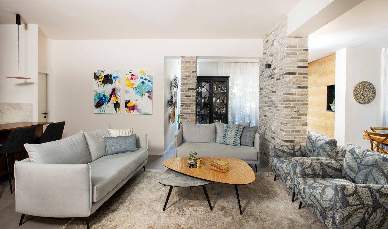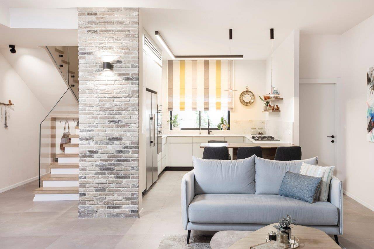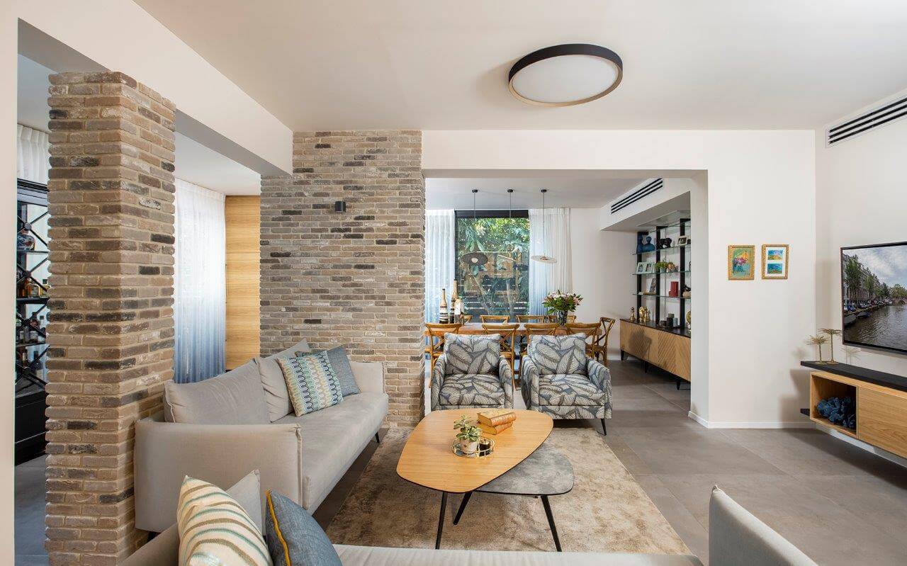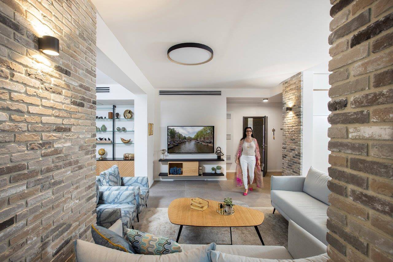 ואכן, השילובים בין ישן לחדש וחם לקר ניכרים מאוד ברחבי הדירה, בפרט בכל הקשור לחומרים, טקסטורות וצבעים. כך למשל הבריקים עמם השתמשה צימבר לחיפוי קיר המבואה והעמודים הקונסטרוקטיביים באזור הסלון. "הרצון לייצר בית מאוד חם הוביל אותנו להשתמש בבריקים, אותם שיבצנו בפריסה רנדומלית וכמה שיותר אורגנית וטבעית, ובשפע מוצרים ופריטים מעץ כמו רצפת עץ אלון מעושן (חומר בו השתמשנו גם לחיפוי שלחי המדרגות), דלפק עץ אגוז במטבח ודלתות עץ מחורצות בספריות".