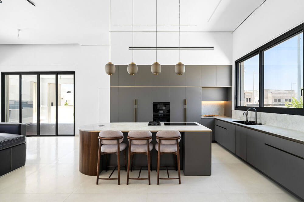 לטובת חזיתות המטבח נבחר אקריל בגוון אפור חאקי בשילוב פסי ניתוק מפליז. פינת הקפה והאי המעוגל מחופים עץ אלון אירופאי שחור מעושן, וויטרינת עץ משולבת עם זכוכית אנטי סאן בגוון חום.