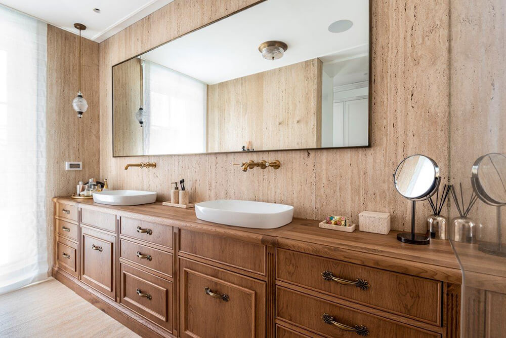 הסוויטה כוללת גם חדר ארונות, ממנו מגיעים בני הזוג למקלחת מפוארת עם אסלה חשמלית מתרוממת, ארון עץ אלון, שני כיורים ומראה ענקית. המקלחת מצוידת בראשי טוש זוגיים ומפלים, עם ג'טים מתקדמים בכל צד. בחדר הרחצה יש רמקולים נסתרים, חימום תת רצפתי, והחיפוי עשוי מלוחות טרוונטין מקיר ועד תקרה.
