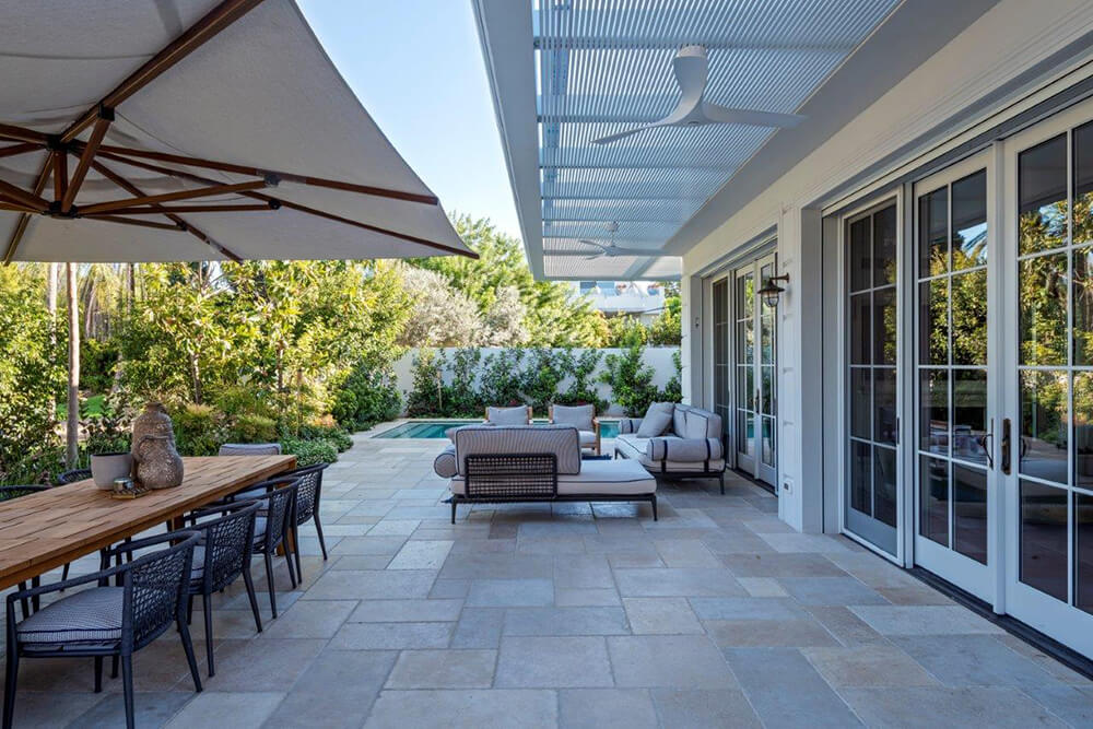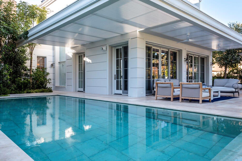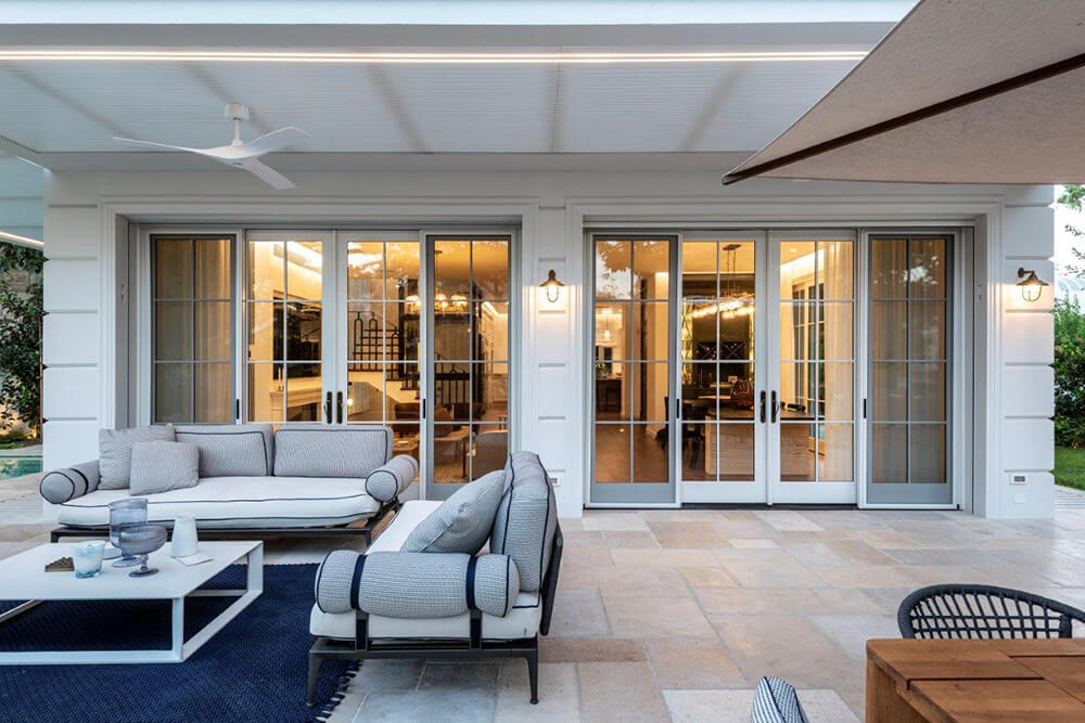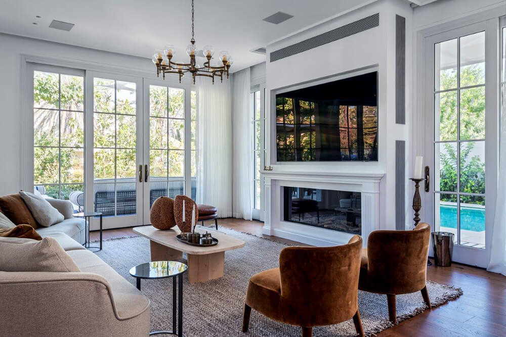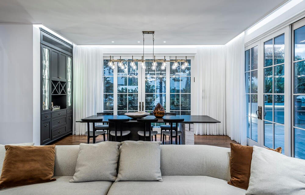 הסלון ופינת האוכל עוטפים את הבית עם ויטרינות אירופאיות המשקיפות לבריכה. הסלון כולל קיר כחול עם קמין קלאסי וכולל גם ספרייה עשירה. ישנן מערכות ישיבה בגווני גרייז' וקטיפה ברונזית, אשר משתלבות בהרמוניה עם תאורה אירופאית.