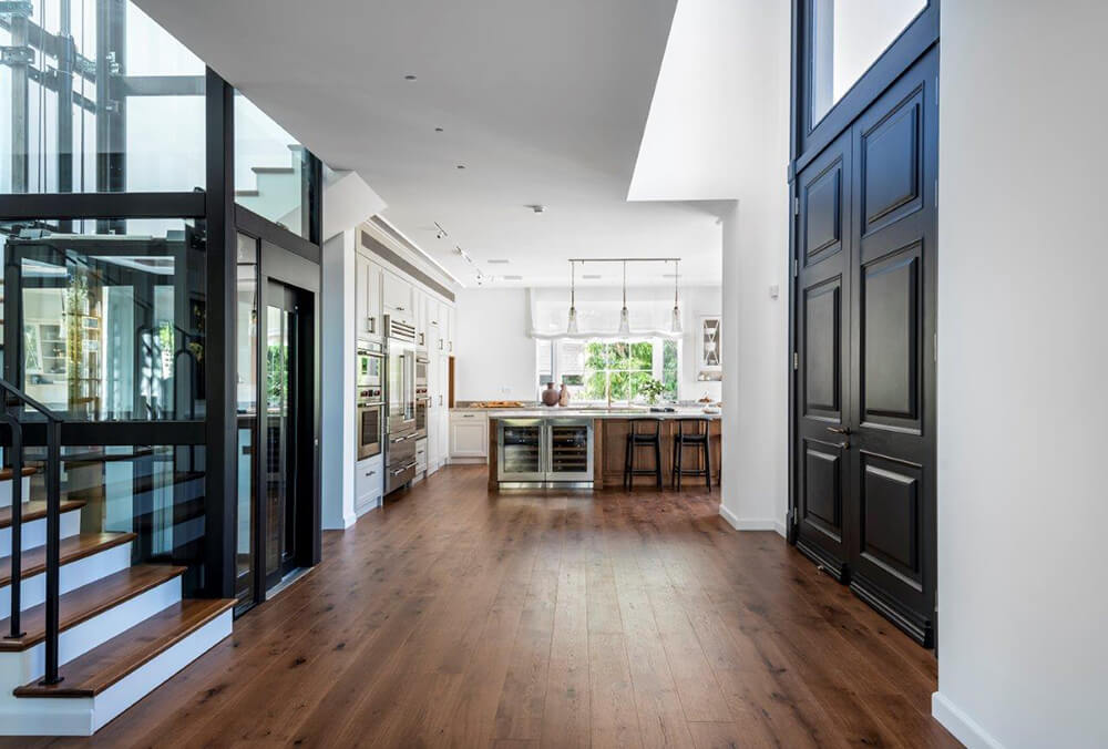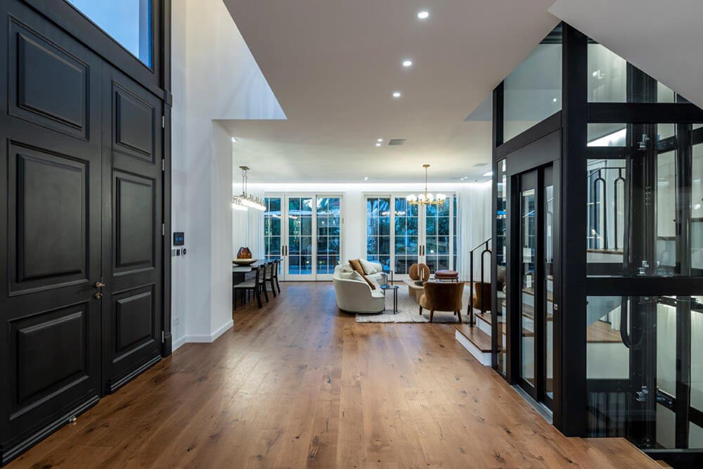 הכניסה לבית מרשימה עם דלת בגובה של 6.5 מטרים, מעליה חלון זכוכית שנותן תחושת גובה ומאפשר מבט פנורמי מהקומות העליונות. המדרגות, המלוות במעלית מזכוכית, ממוקמות במרכז הבית ומחברות בין הסלון למטבח.
