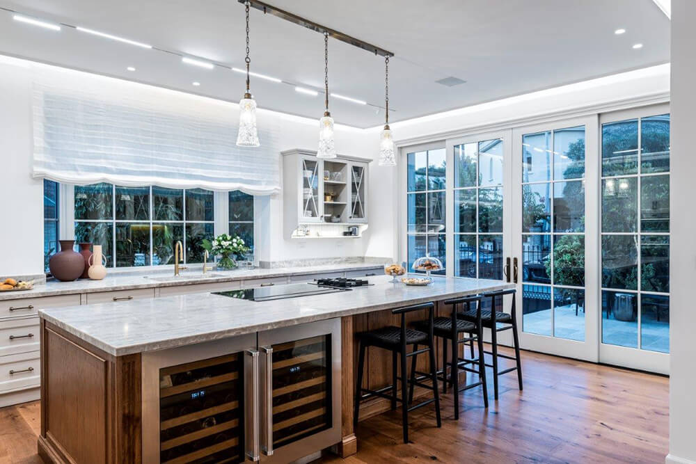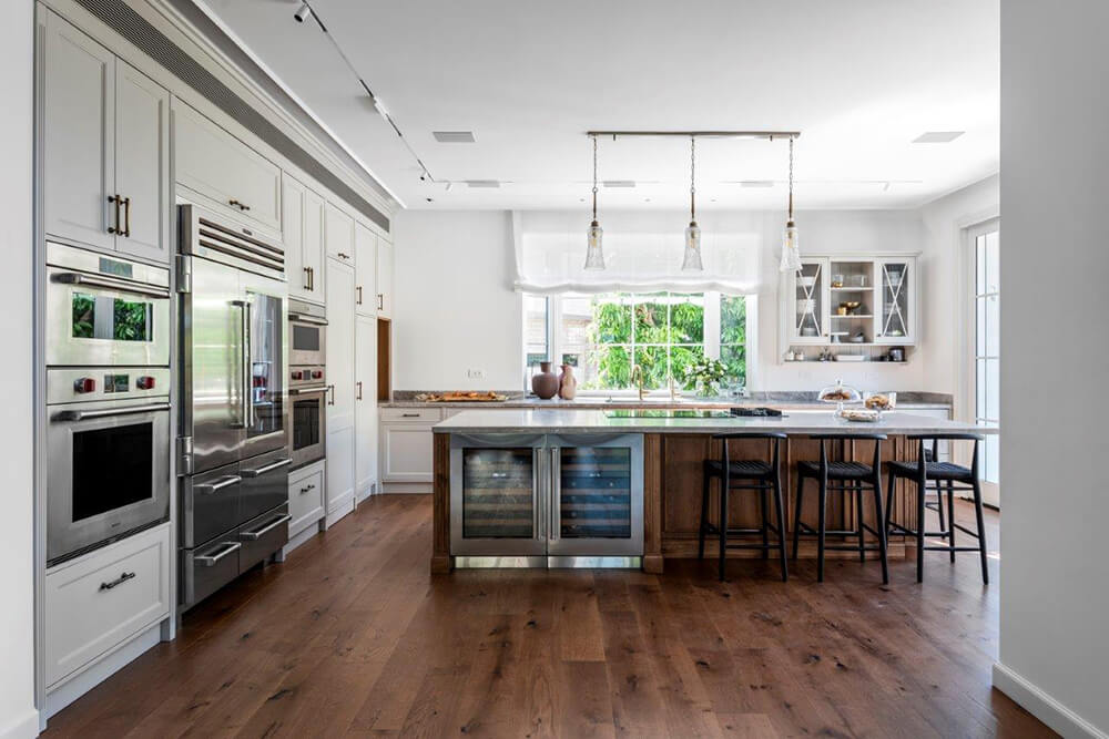 המטבח תוכנן ככשר, מרווח וכולל 4 תנורים, מקרר יוקרתי, ומשטחי עבודה עשויים שיש. דלתות הזכוכית הגדולות פותחות את המטבח לגינה הקדמית, ומאפשרות זרימה טבעית בין הפנים לחוץ. הצבעים בגווני שמנת וגרייז' טבעי, עם אי עץ אלון במרכזו. המקרר ממוקם בקיר אחסון שכולל גם דלת נסתרת למזווה סודי, המכיל עוד מקררים ומדפים פתוחים.