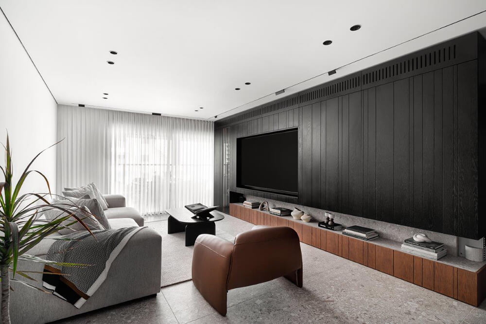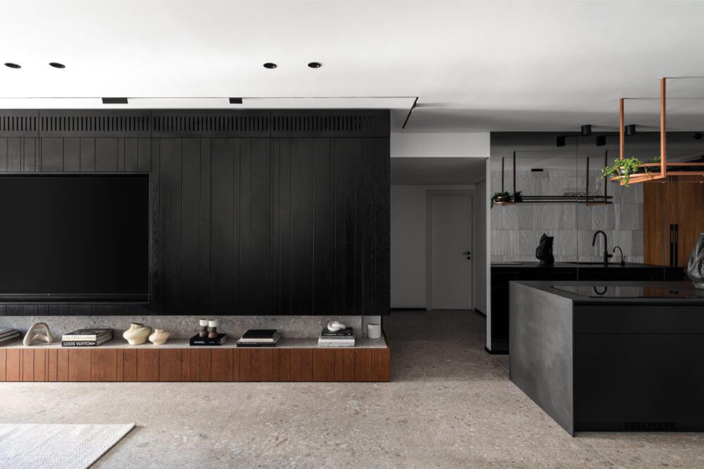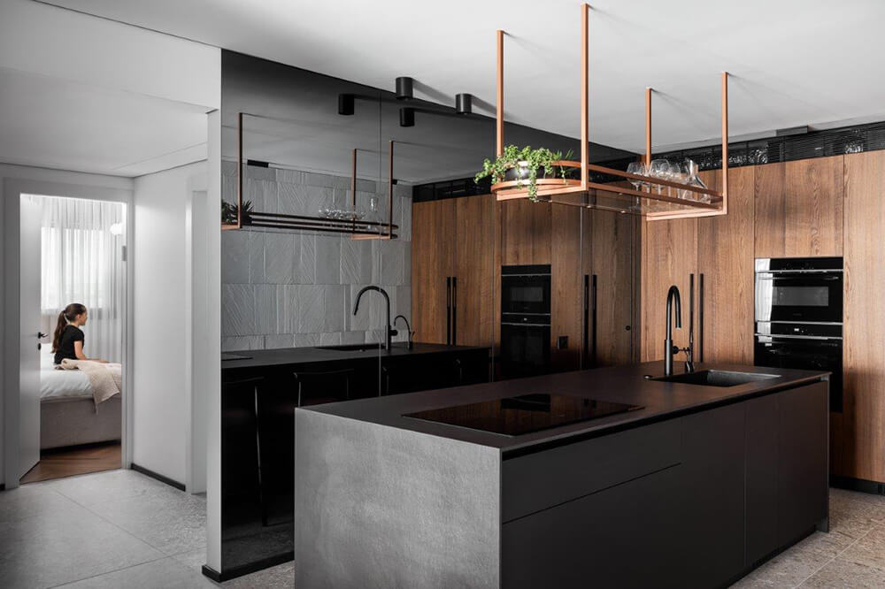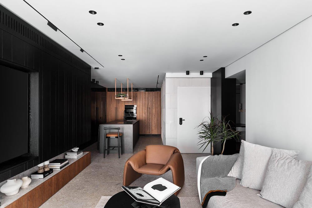 דירת קבלן בבאר יעקב: בכיכובם של העץ, אבן וגווני האפור