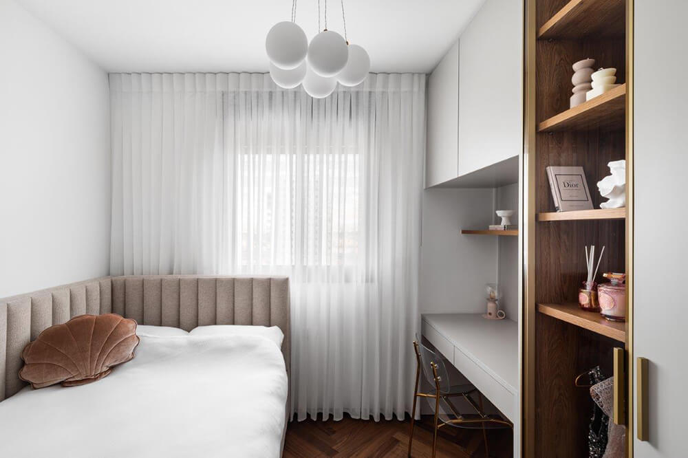בחללי חדרי השינה נבחרה רצפת פרקט עץ איכותי כדי להוסיף חמימות, בגוון חמים ומעודן של עץ אגוז. בכל אחד מחדרי השינה של הילדים תוכננו ארונות דלקוב, בעיצוב אישי ותוך התאמה לילד, בשילוב דלתות זכוכית.