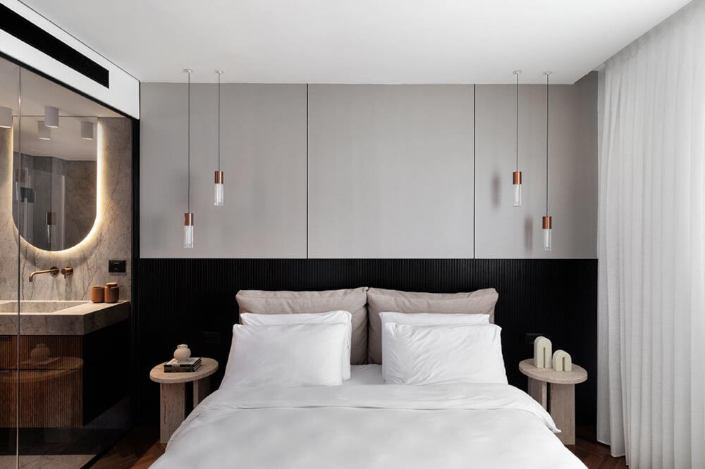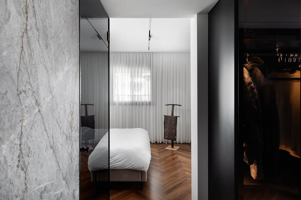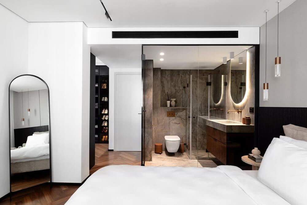 "בנוסף, החלטנו לשבור את קירות המקלחת הקיימים בחדר השינה ולהמיר אותם במחיצות זכוכית, כדי להעניק לחלל תחושת מרחב וזרימה ומראה מודרני ונקי שמעניק תחושת סוויטה פרטית, כמו גם חיפוי של אריחים מדוקקים שהוסיפו מראה יוקרתי ואלגנטי" מסבירה ביטון.