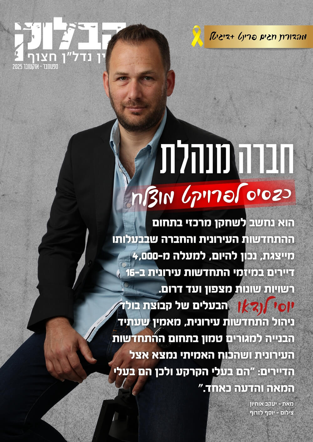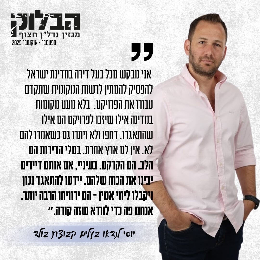 אני מבקש מכל בעל דירה במדינת ישראל להפסיק להמתין לרשות המקומית שתקדם עבורו את הפרויקט. בלא מעט מקומות במדינה אילו שיזכו לפרויקט הם אילו שהתאגדו, דחפו ולא ויתרו גם כשאמרו להם לא. אין לנו ארץ אחרת. בעלי הדירות הם הלב. הם הקרקע. בעיניי, אם אותם דיירים יבינו את הכוח שלהם, יידעו להתאגד נכון ויקבלו ליווי אמין – הם ירוויחו הרבה יותר. אנחנו פה כדי לוודא שזה קורה.”