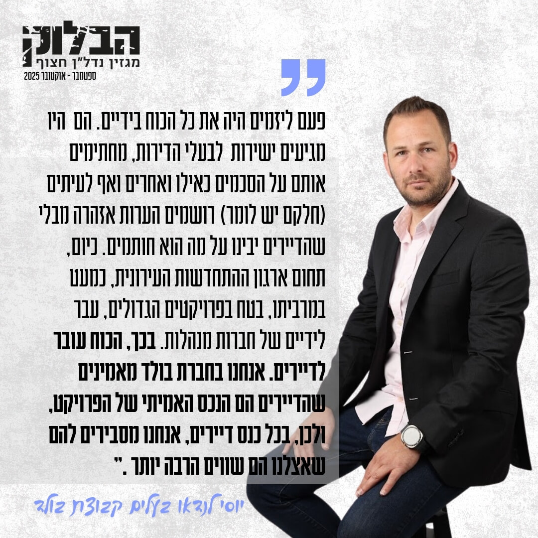 "חשוב שתבין", מסביר לנו יוסי בהמשך לשאלה, "פעם ליזמים היה את כל הכוח בידיים. הם היו מגיעים ישירות לבעלי הדירות, מחתימים אותם על הסכמים כאילו ואחרים ואף לעיתים (חלקם יש לומר) רושמים הערות אזהרה מבלי שהדיירים יבינו על מה הוא חותמים. כיום, תחום ארגון ההתחדשות העירונית, כמעט במרביתו, בטח בפרויקטים הגדולים, עבר לידיים של חברות מנהלות. בכך, הכוח עובר לדיירים. אנחנו בחברת בולד מאמינים שהדיירים הם הנכס האמיתי של הפרויקט, ולכן, בכל כנס דיירים, אנחנו מסבירים להם שאצלנו הם שווים הרבה יותר ."