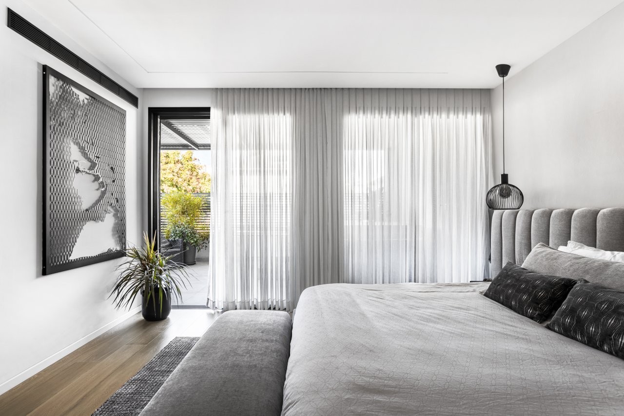 הקומה העליונה הוקדשה להורים, עם סוויטה מרווחת שכוללת חדר שינה ללא טלוויזיה, קיר זכוכית לחדר הארונות ואלמנטי עיצוב עדינים כמו יצירת מתכת שחורה. חדר הארונות עוצב כחלל נגיש ומפנק, ובו פינת איפור תלויה מהתקרה, בעוד חדר הרחצה ממשיך את השפה הנקייה של הבית עם חומרים איכותיים ותאורה רכה.
