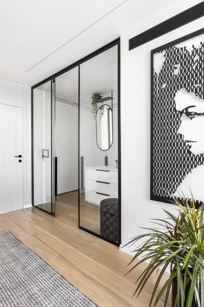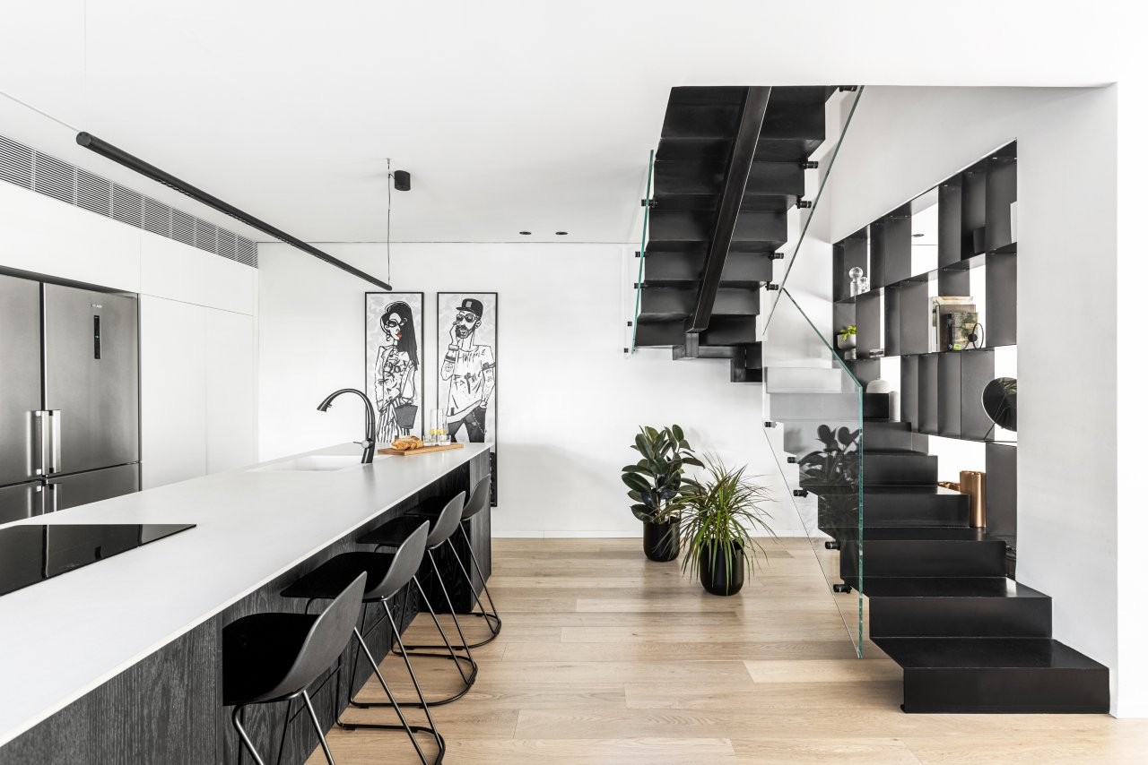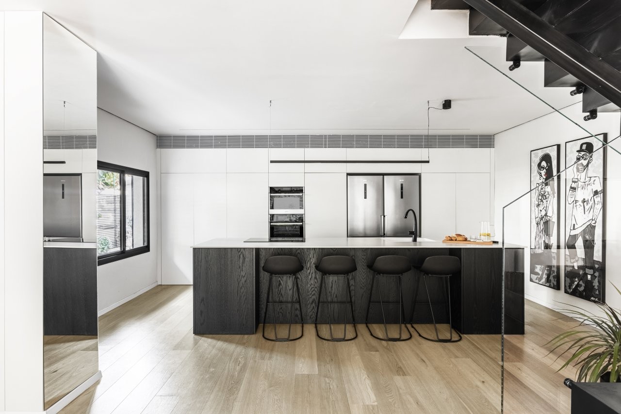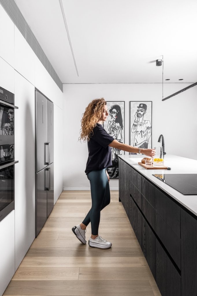 העיצוב נשען על פלטת צבעים מונוכרומטית של שחור ולבן, בשילוב פורניר שחור שמעניק עומק וחום. פרקט האלון המולבן מאזן את הקרירות ומכניס תחושת טבעיות. הפרקטיקה לא פחות חשובה: דלת מעבר חכמה הוסתרה בתוך החזיתות, ומובילה לאזור השירות, בעוד אזור העבודה פונה לסלון כך שהבישול נעשה חלק בלתי נפרד מהחיים החברתיים בבית.