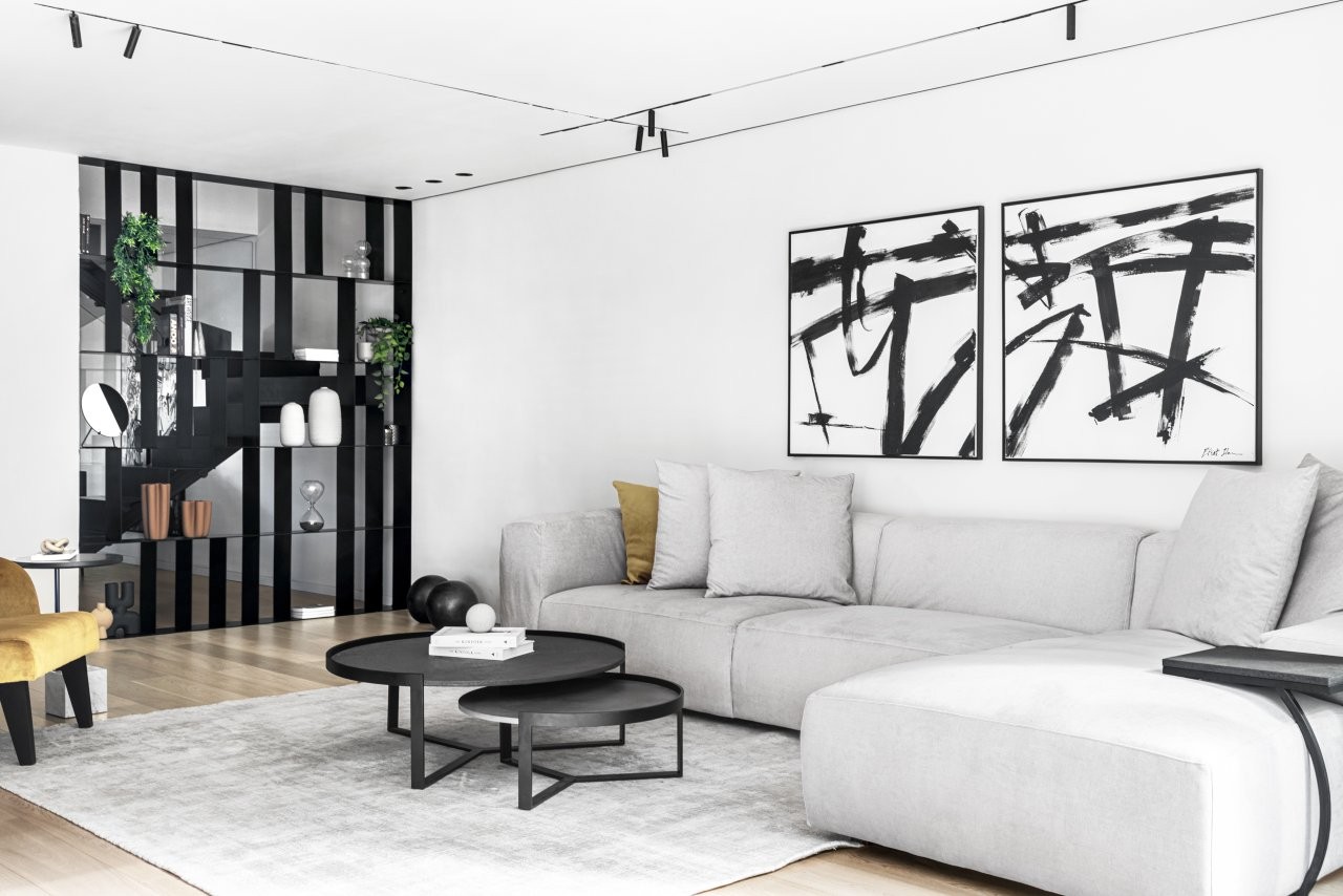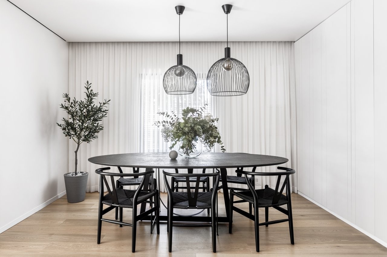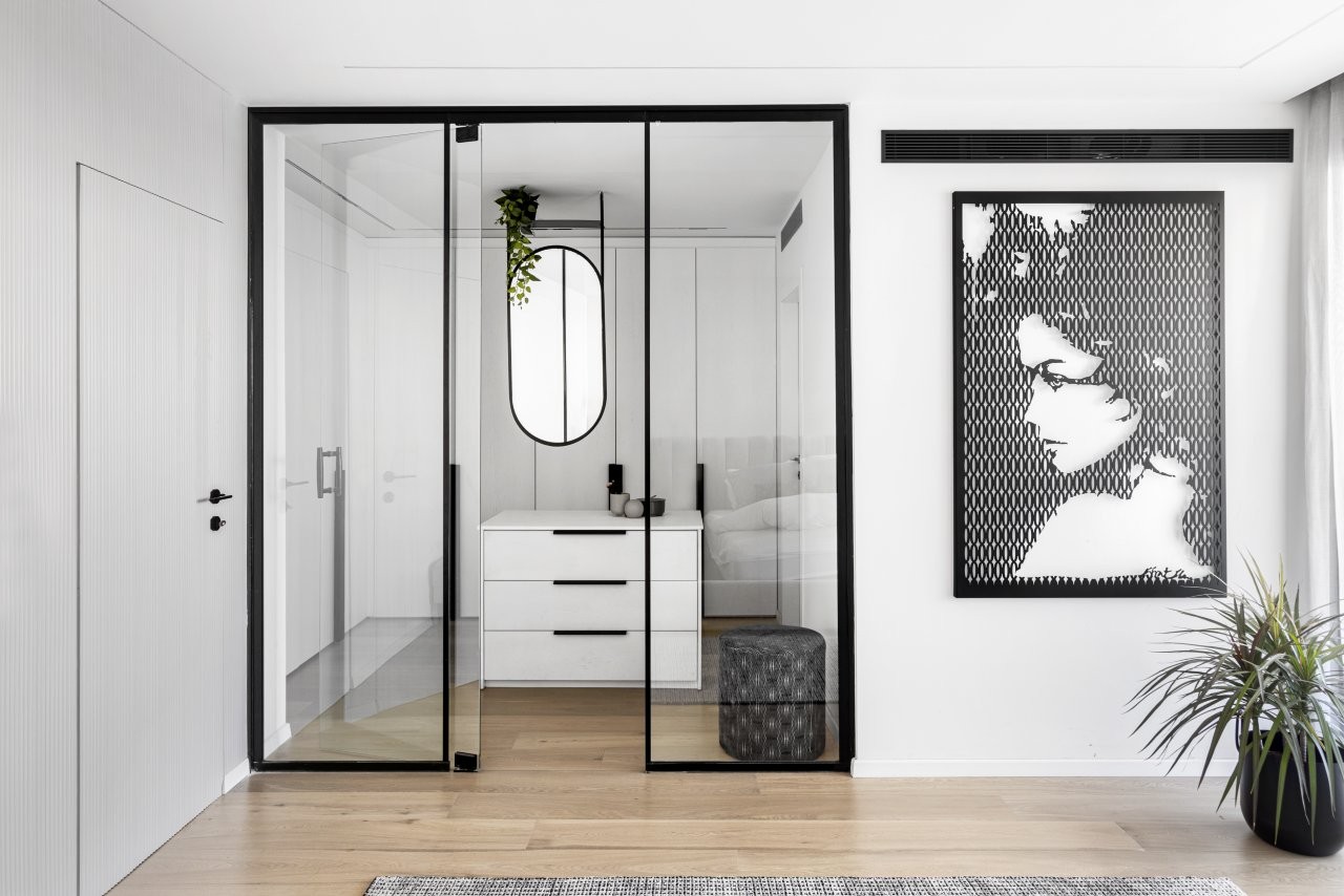 העיצוב נשען על פלטת צבעים מונוכרומטית של שחור ולבן, בשילוב פורניר שחור שמעניק עומק וחום. פרקט האלון המולבן מאזן את הקרירות ומכניס תחושת טבעיות. הפרקטיקה לא פחות חשובה: דלת מעבר חכמה הוסתרה בתוך החזיתות, ומובילה לאזור השירות, בעוד אזור העבודה פונה לסלון כך שהבישול נעשה חלק בלתי נפרד מהחיים החברתיים בבית.
