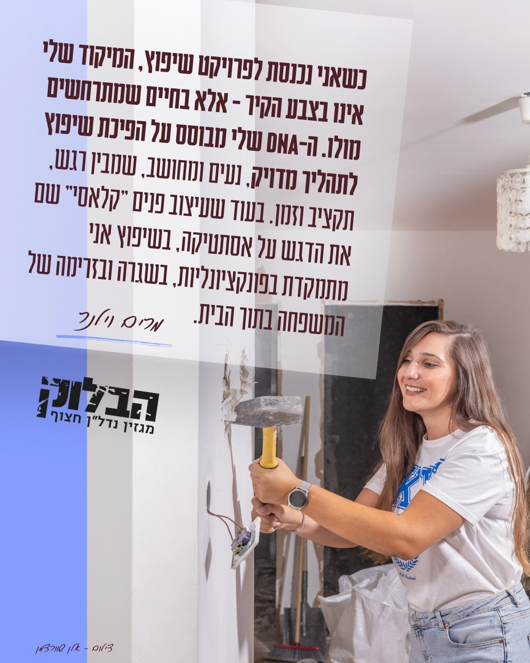 “שיפוץ הוא מהתהליכים הרגשיים והמשמעותיים ביותר שאנשים עוברים, והמטרה שלי היא להפוך אותו מתהליך מלחיץ לתהליך צפוי, שקוף ונעים.