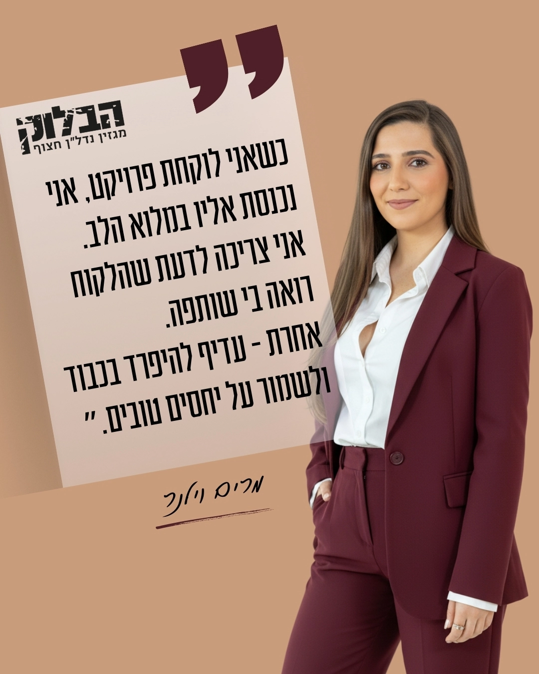 “אני עובדת אך ורק עם קבלנים מורשים ובעלי ניסיון, ובודקת שיש להם ביטוח קבלנים בתוקף, זה עניין מקצועי וערכי כאחד, במיוחד מאז 7 באוקטובר. לפני כל התחלה בשטח חייבים להיות חתומים שלושה מסמכים: