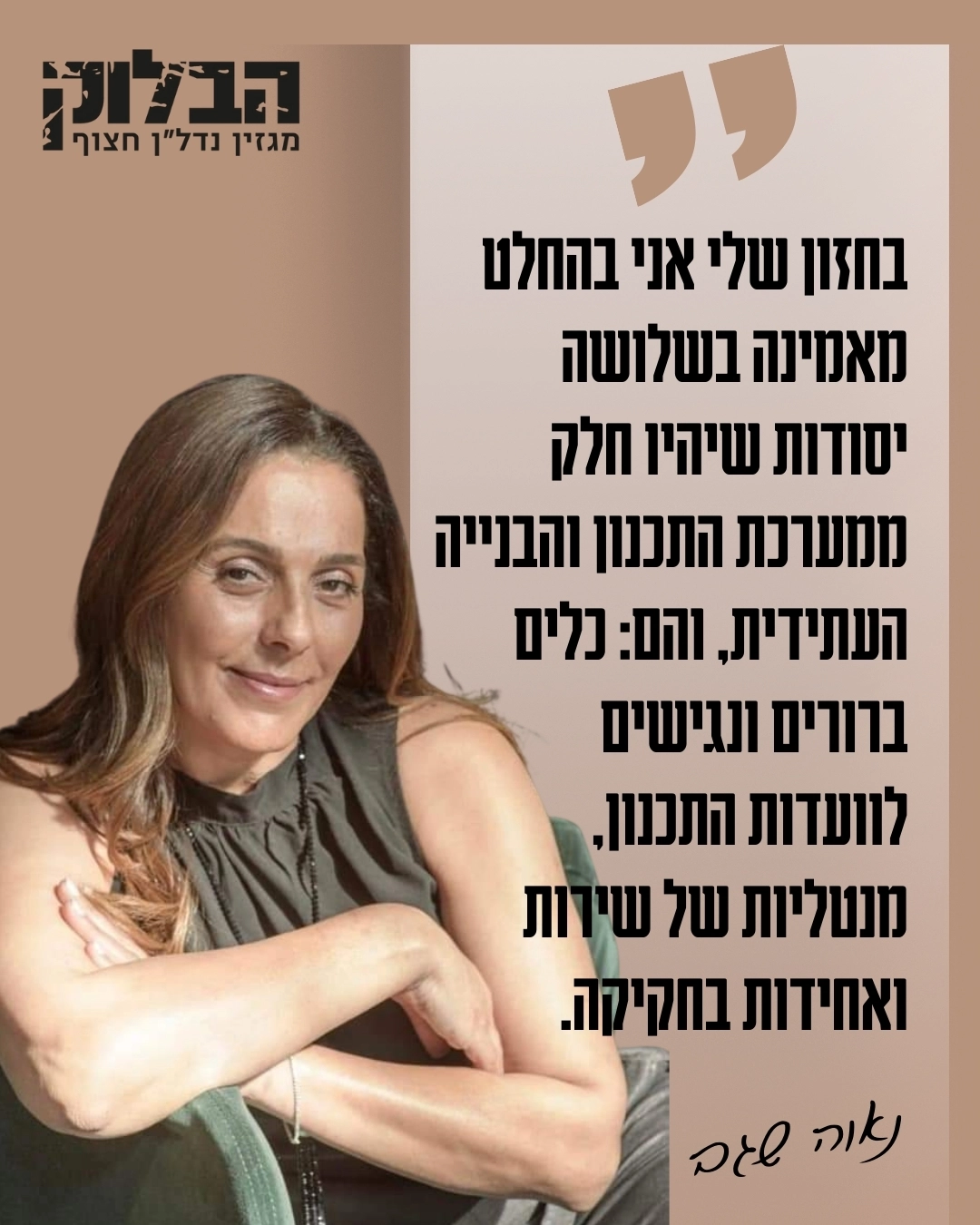 "בחזון שלי אני בהחלט מאמינה בשלושה יסודות שיהיו חלק ממערכת התכנון והבנייה העתידית, והם: כלים ברורים ונגישים לוועדות התכנון, מנטליות של שירות ואחידות בחקיקה.